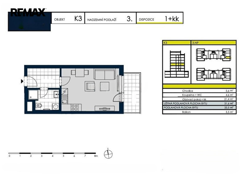 - obytnou místnost s kuchyňským koutem (21,4 m²),