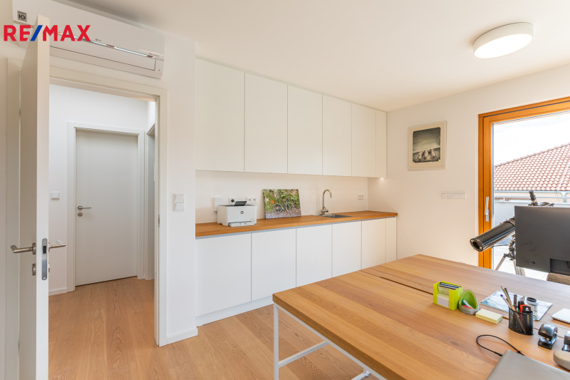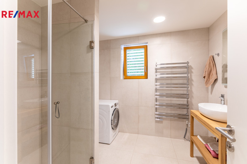 V přízemí se nachází prostorný obývací pokoj propojený s kuchyňským koutem a vstupem na zahradu, koupelna s toaletou. Dále dvojgaráž s možností nabíjení elektromobilu. Zahrada je osázena okrasnými i ovocnými dřevinami a disponuje vlastní studnou s rozvodem užitkové vody pro zavlažování. V prvním patře jsou čtyři ložnice a dvě koupelny s toaletou. Druhé patro nabízí samostatnou pracovnu (s možností využití jako druhá kuchyně), další ložnici, koupelnu s toaletou a prostornou terasu s výhledem do zeleně. Suterén domu je rozdělen do čtyř místností, které aktuálně slouží jako technická místnost, sklad a dvě domácí tělocvičny.