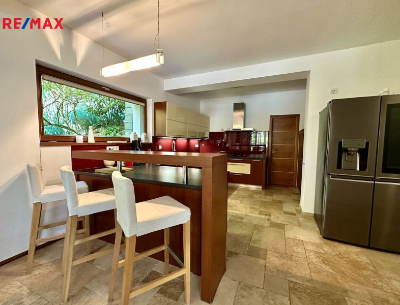 Po schodech dolů se z tohoto podlaží dostaneme do kuchyně s jídelnou a obývacím pokojem s krbovou vložkou. Z obývacího pokoje je vstup na terasu s pergolou na kterou navazuje bazén se slanou vodou a protiproudem. Zastřešení bazénu a tepelné čerpadlo prodlužují možnost koupání až o tři měsíce v roce.