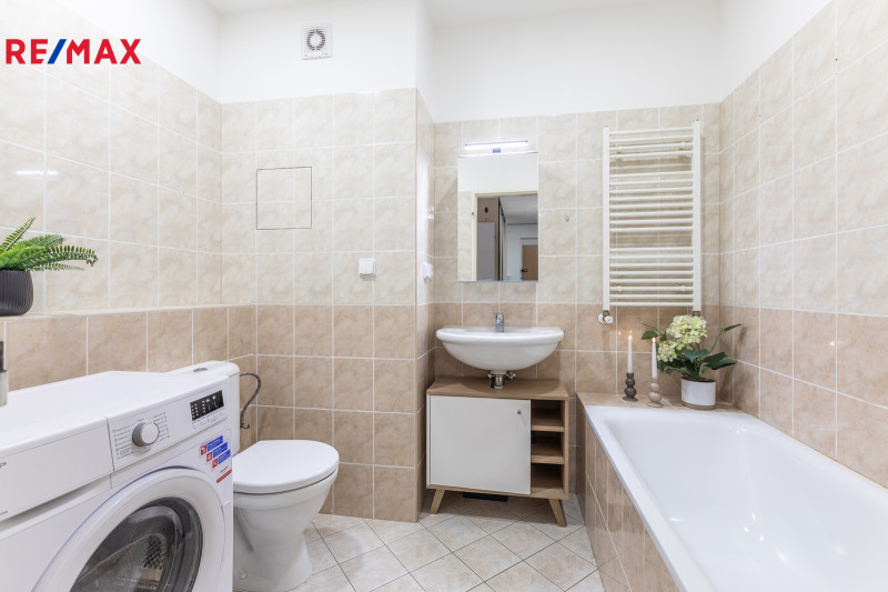 Přízemí bytu nabízí obývací pokoj s krásnou kuchyní a vstupem na balkon s výhledem do zástavby rodinných domů a dále údolím soutoku Berounky s Vltavou, chodbu s vestavnou skříní a prostorem třeba i na kočárek a koupelnu s vanou, WC a pračkou.
