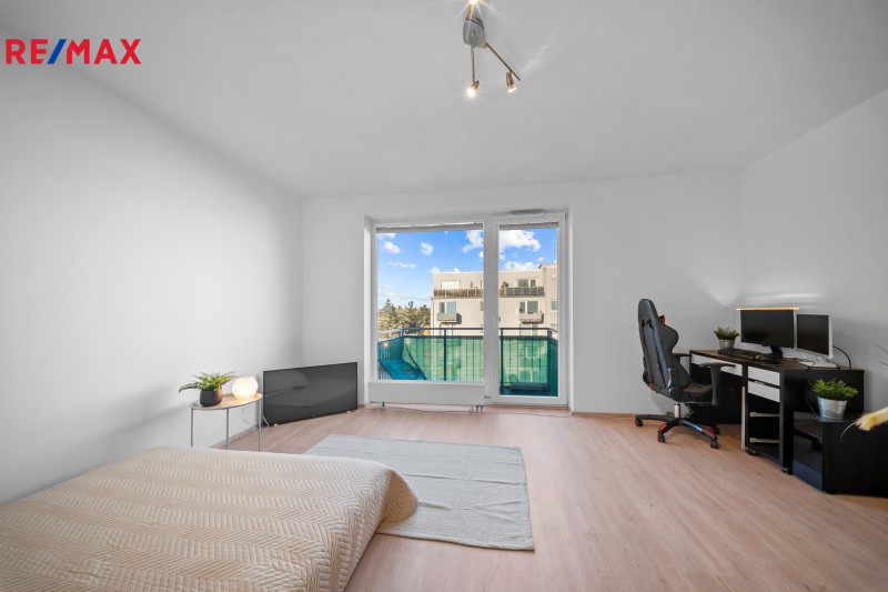 Dispoziční řešení 1+kk nabízí obývací pokoj s plně vybavenou kuchyní a s balkonem, orientovaným do klidné ulice v rámci areálu developerského projektu, chodbu s prostorem na vestavěnou skříň (nyní využito k umístění velké lednice) a koupelnu s vanou, WC a místem pro pračku. Kuchyně je vybavena všemi spotřebiči včetně myčky.